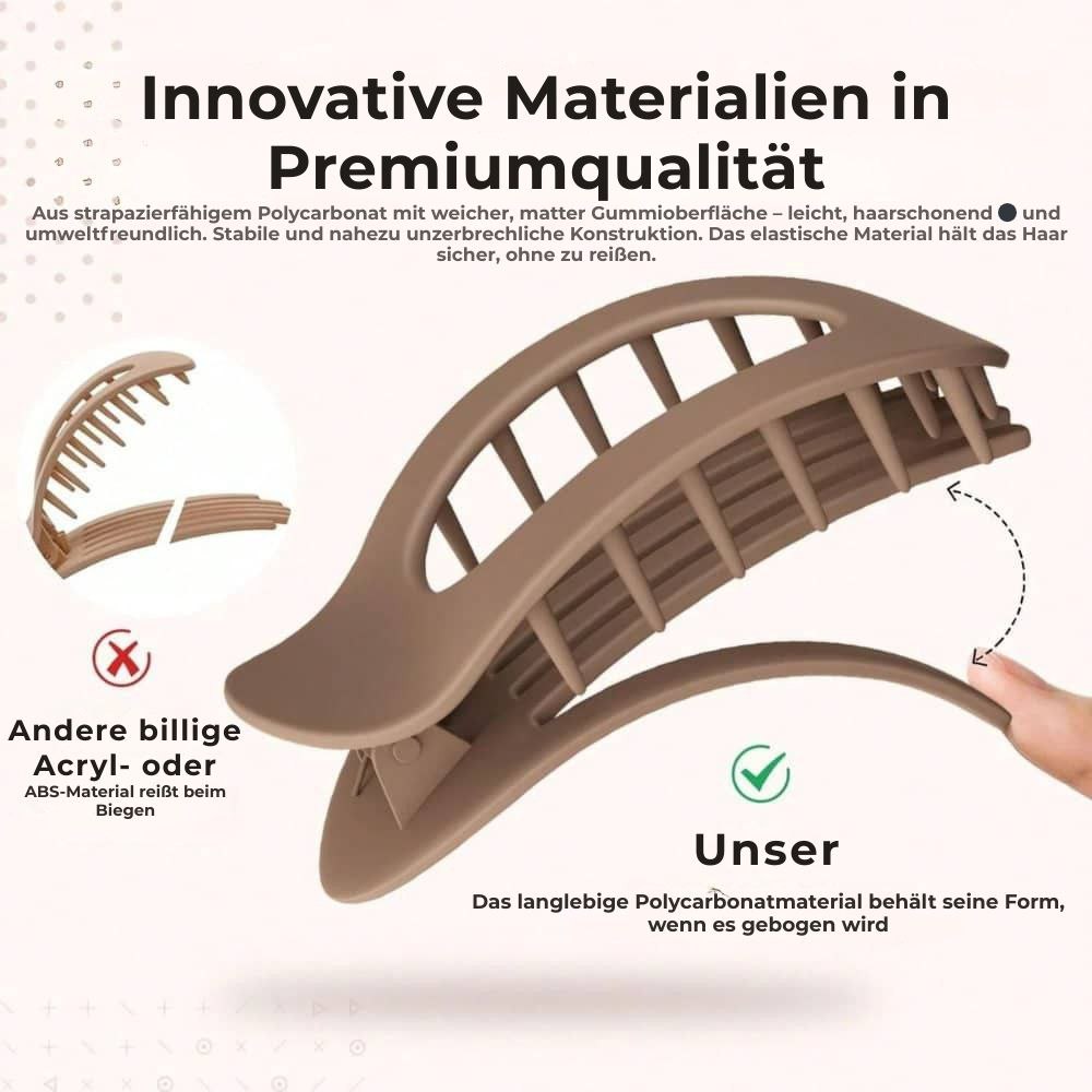 Clipia wurde mit Sorgfalt entwickelt – keine scharfen Kanten, kein Ziehen. Die ergonomische Konstruktion schützt sowohl Haar als auch Kopfhaut und sorgt für ein angenehmes Gefühl von morgens bis abends. Du kannst dich darauf verlassen, dass sie fest sitzt, ohne zu stören.