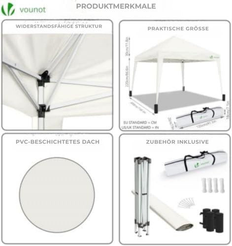 Der VOUNOT® Pavillon ist mehr als nur ein Unterstand – er ist eine Einladung, das Leben im Freien in vollen Zügen zu genießen, egal bei welchem Wetter. Ob beim Grillen im Garten, am Marktstand oder beim Festival – dieser Pavillon ist stets einsatzbereit. Durch das intelligente Design vereint er Leichtigkeit mit Stabilität und ist überall einsetzbar. Der Aufbau ist so intuitiv, dass Sie im Handumdrehen startklar sind – mehr Zeit für das, was zählt: den Moment genießen.